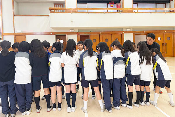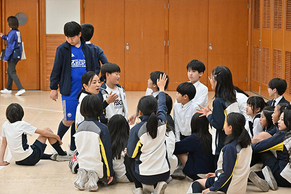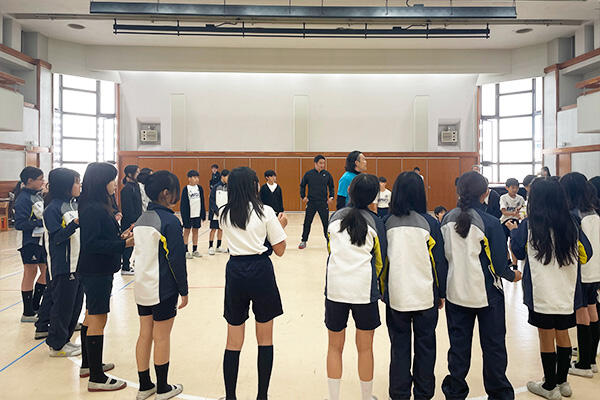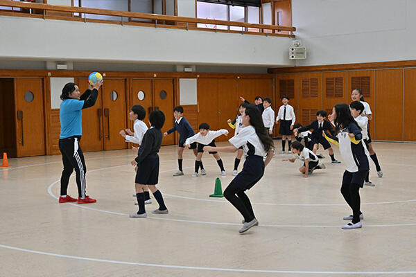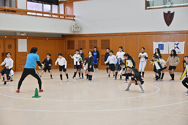 一方の松田さんの実施クラスでは、ボールを手渡しでゴールまで運ぶというアクティビティに全員で取り組み、タイムを短縮することに挑戦。当初は21秒かかっていましたが、皆で考え、最後は9秒台まで記録を更新することができました。このアクティビティでは結果を出すことと同じくらい、想像力や協調性といった目標を実現するまでの「過程」に重きが置かれています。そして皆で考えた案が上手くいった時には、大きな歓声が上がりました。