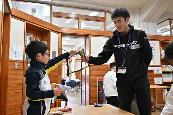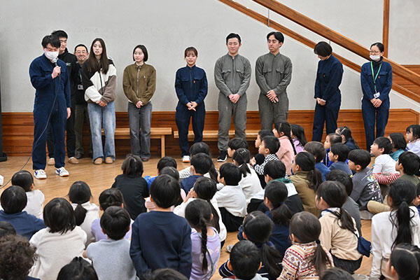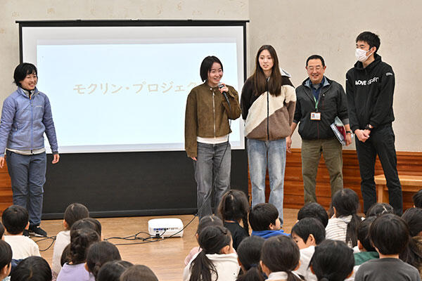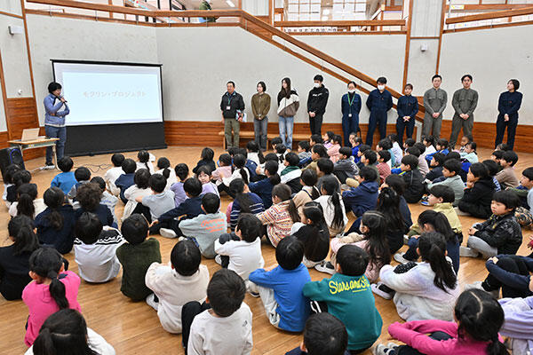 経塚校舎(PrimaryDivision(小学校1年生~5年生)が学ぶ校舎)の東ホールに集まった1年生。この日は教育学部教育学科の市川直子教授とゼミ生、農学部環境農学科の山﨑旬教授と農学部生も参加し、児童たちの指導を担当します。まずは小学部の廻谷先生がスライドで剥皮間伐や染色を振り返り、「森を守る」、「森を活かす」ことの重要性を認識した児童たち。その上で今日の取り組みである聖山労作についての理解を深めます。
