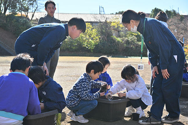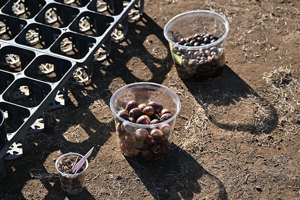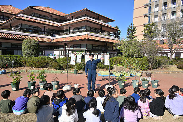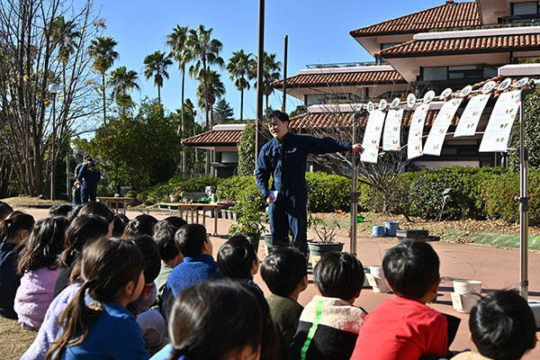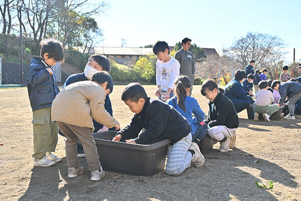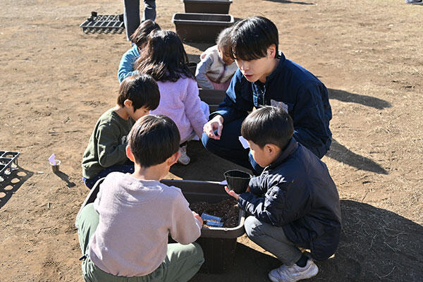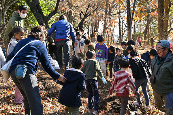 また午前中には市川ゼミの学生に教わりながら、どんぐりの種も植えました。小学部では昔から「玉川の丘をどんぐりの木でいっぱいにする」という児童らの夢が受け継がれています。今回も未来の後輩たちにその夢をつなぐため、みんなでどんぐりを植えました。