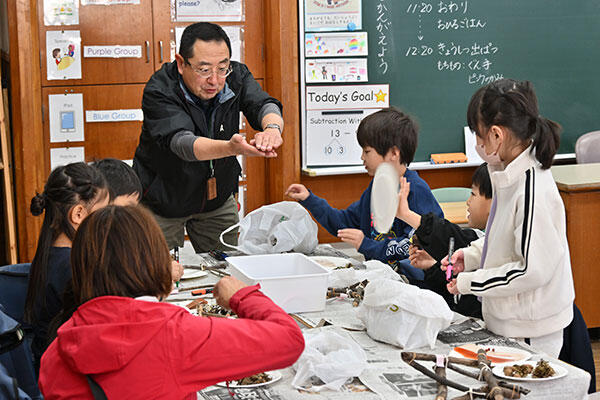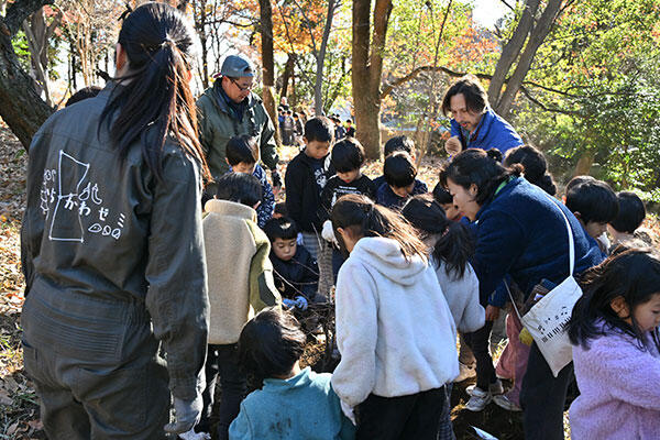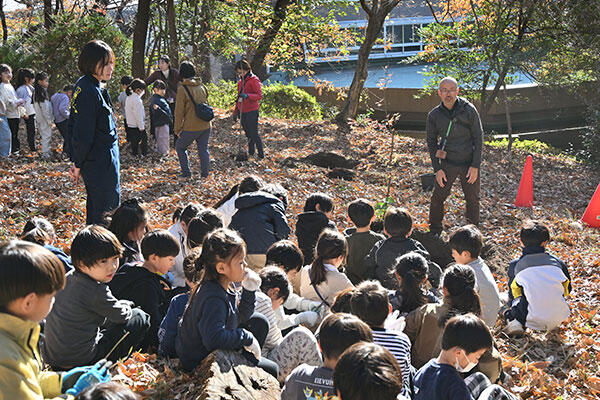 まず、山﨑先生から「午前中のリース作りで使った枝やどんぐりは、すべて木から生まれたものです。そこで午後は木を植えてもらおうと思います」というお話がありました。ここ数年で間伐の進んだ聖山ですが、若い木を育てるため、毎年植樹が行われています。今回は、カナダピンオークやムクロジなどを聖山の南西側に植えることに。児童らはクラスごとに木を植える穴に落ち葉を敷き詰め、植木の周囲に土や肥料を撒いていきます。また植樹にあたり、農学部環境農学科の友常満利准教授の指導で炭の散布にも挑戦しました。キャンパス内で間伐した竹や木を使った炭(バイオチャー(biochar))を使って土壌改良やCO2を削減する研究に取り組んでいる友常先生に教わりながら、植えた木の周囲に炭を撒いていきます。皆で協力したことで、午後の植樹はあっという間に終了しました。