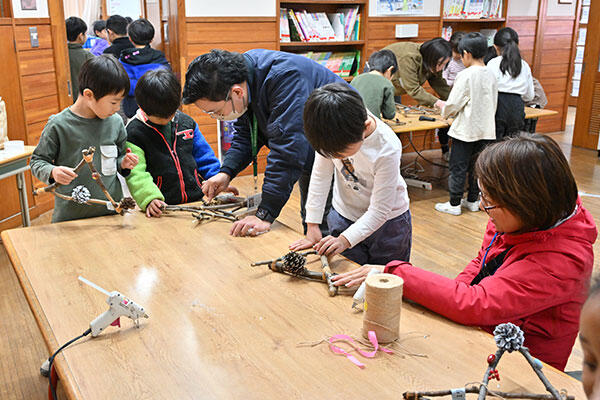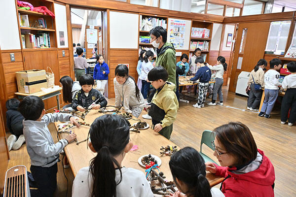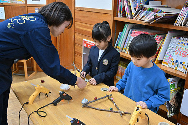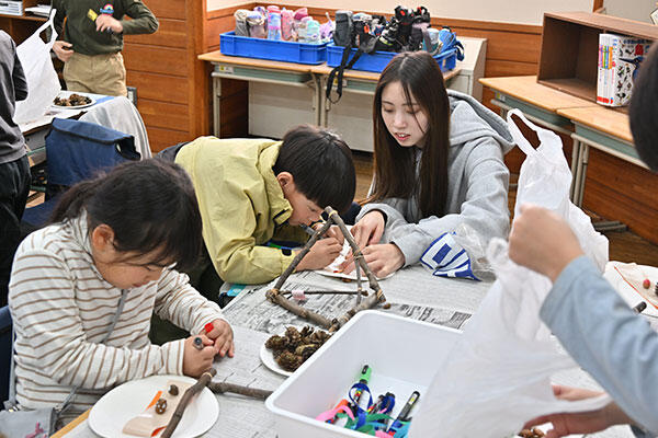 その後は各教室に戻り、リース作りに挑戦。それぞれがクリスマスやアニメ作品、好きな乗り物などをテーマに、木枠にどんぐりや松ぼっくりを接着し、リースを作っていきます。時には大学生のお兄さん、お姉さんに相談しながら、時には友だち同士で意見を出し合いながら、個性豊かなリースが完成しました。翌日の13日(土)には礼拝堂で学友会主催の卒業生のためのクリスマス礼拝が行われるため、礼拝堂に上る階段の両脇に飾り付けられる予定で、児童らも「卒業生の皆さんに喜んでもらいたい」と、一生懸命取り組みました(13日が悪天候予報だったため、リースを撮影した画像をパウチ加工したものを飾りました)。