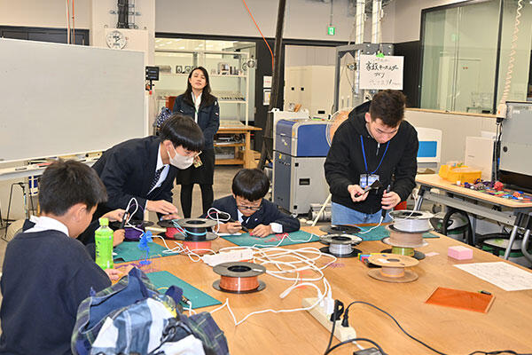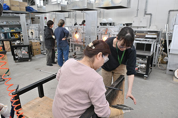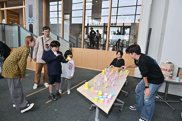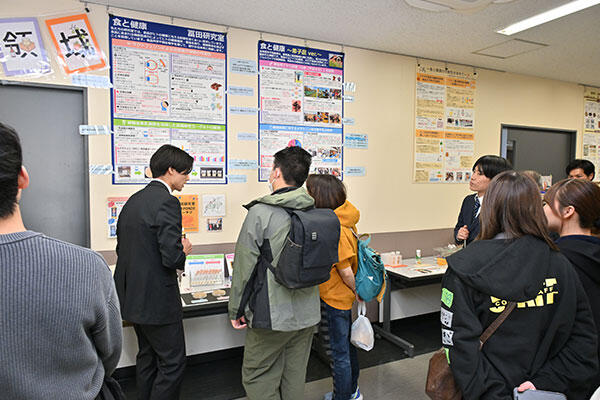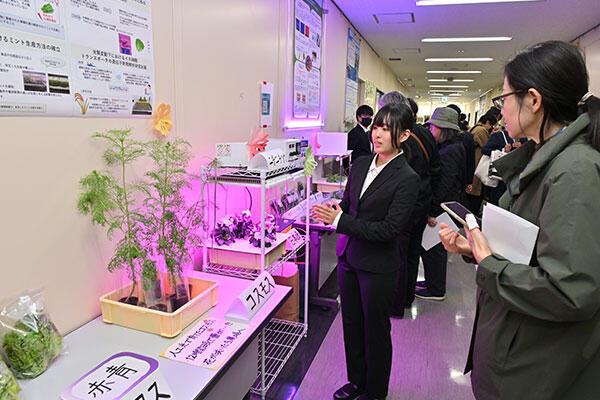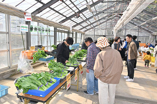 コスモス祭の特徴の一つは、各学部が日頃の研究成果を発表する点にあります。ゼミや研究室を中心に展示を行い、多くの教室でスーツに身を包んだ学生たちが説明を担当。難解な内容を、一般の人にも分かりやすく伝えるといった工夫が見られました。また教育学部による子どもを対象とした遊びのコーナーや、芸術学部によるガラス工房での吹きガラス体験など、さまざまな企画が人気を集めていました。また農学部の農場では、毎年人気の玉川のキャンパス内で育てた野菜の販売が行われました。キャンパスの一番奥という立地にもかかわらずオープン前から長い行列ができ、午前中には売り切れてしまうという人気ぶり。ESTEAM教育を推進し異分野融合に取り組む玉川大学ですが、コスモス祭は学生にとっても他学部の学びを知る、絶好の機会となっています。