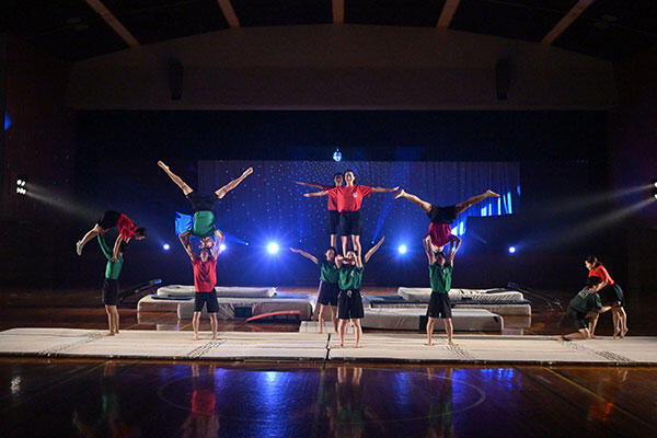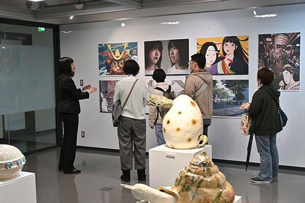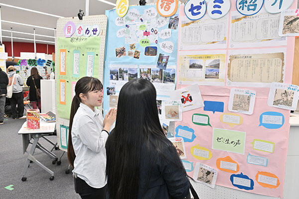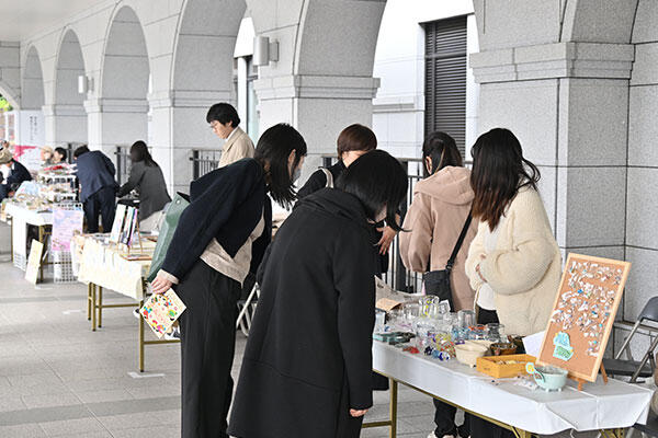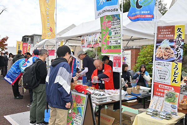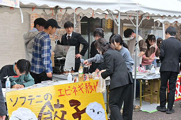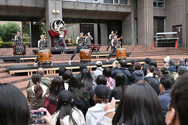 そしてコスモス祭の魅力といえるのが、各クラブによる「課外活動展」や模擬店です。大体育館でダンスドリルチーム「JULIAS」やエアロビックチームが演技を披露したり、ギターアンサンブル部がチャペルでコンサートを行ったり、茶道部が咸宜園で茶会を催すなど、キャンパスのあちこちで日頃の成果の発表があり、多くの観客・参加者を集めていました。また模擬店も、大学教育棟2014周辺やSTREAM Hall 2019、ELF Study Hall 2015など、研究発表が行われている各校舎周辺にブースを出店。昨年度より出店数が増加していることもあり、どのエリアもお客さんで賑わっていました。販売しているもののクオリティだけでなく、接客態度なども評価される「模擬店大賞」という企画もあり、どのブースも丁寧な接客が印象的でした。この他にも経塚オフィス棟前では、包括連携協定を締結している各自治体が地域名産品の販売を行い、人気を博していました。