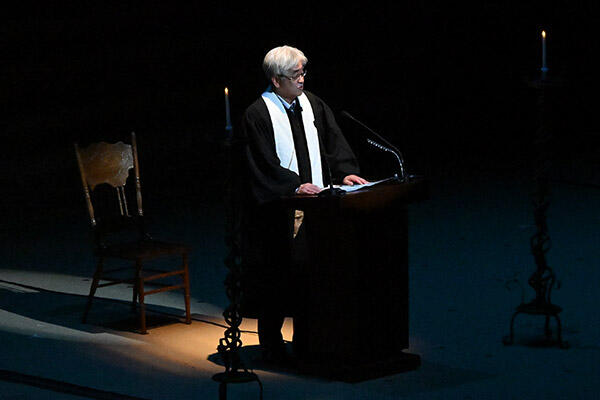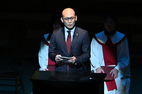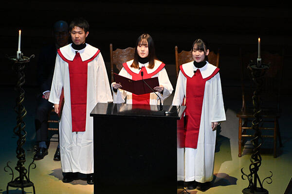 黙祷、音楽学科 中村岩城教授のオルガン前奏、同学科 渡辺明子教授による讃美歌独唱が終わると、司式のリベラルアーツ学科 青野和彦教授がクリスマスアドベント(待降節)や救世主などについてお話しされ、「希望の光を求め続けましょう」とおっしゃいました。そして、学生による聖書の朗読、学生約50名で編成された聖歌隊が音楽学科 松川儒教授の指揮のもと讃美歌を奉唱した後、参加者全員で起立して讃美歌「神の御子は今宵しも」を歌いました。