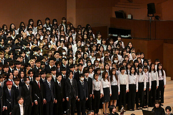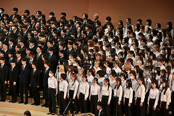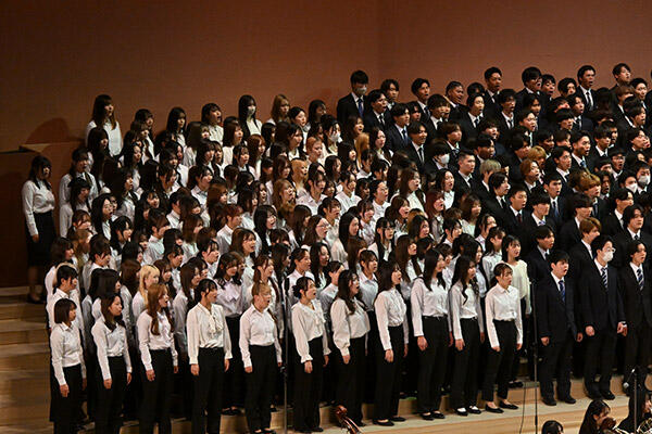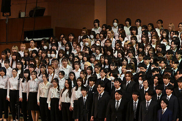 玉川大学では1年次に歌うことを通して、音楽の表現方法、歴史、様式などを複合的に学びます。最初は「なぜ、大学で音楽が必修?」と考えた学生もいたかもしれませんが、地道に重ねた練習の成果が800名の大合唱となって大ホールに響き渡ったとき、個人の力だけでは不可能な圧倒的な感動を味わうことのできる貴重な体験になったのではないでしょうか。