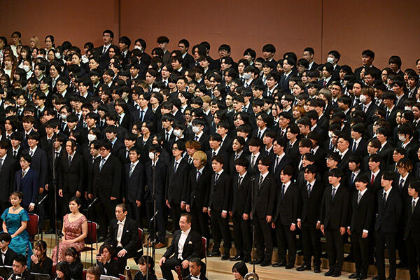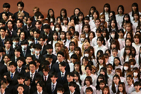 17時からは音楽祭です。8学部17学科の1年生約1,650名が2つのグループに分かれて、L.v.ベートーヴェン作曲「交響曲第9番ニ短調 作品125〈合唱付〉」の最終章(第4楽章)「歓喜に寄せて」を合唱しました。