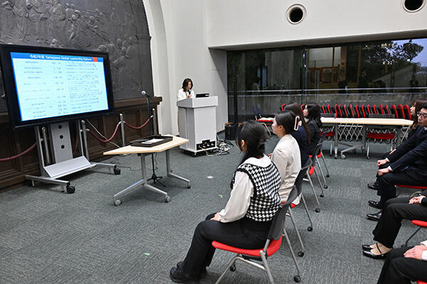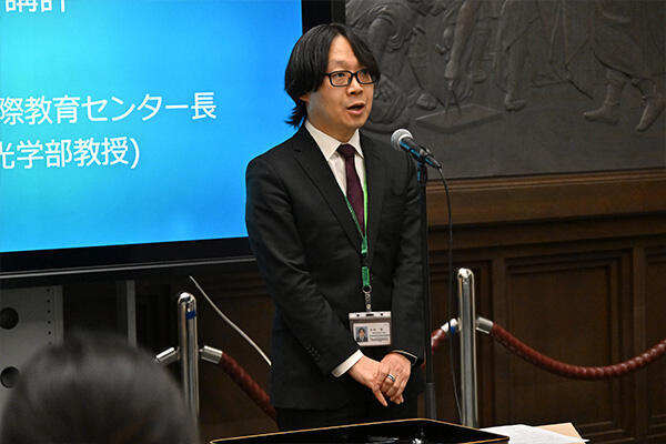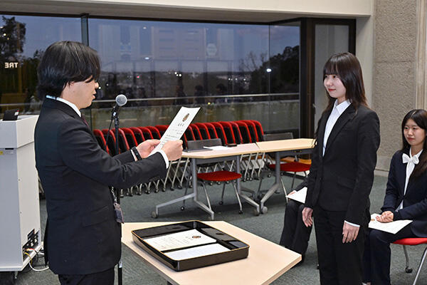 「本学はCAP制度※などもあり、国際的な活動に時間を割くことは容易ではなかったと思います。そうした中でも皆さんは時間を作り、また学内外で参加すべきプログラムを見つけ、地道に活動を積み重ねてこられました。そんな皆さんにお伝えしたいのは、①この取り組みを一時のものにしないということ、②今回の表彰を自身の活動を振り返る機会にしてほしいということ、そして③これをゴールとせず研鑽を重ねてほしいということ、最後に④オンラインの時代ではあるけれども対面でのコミュニケーションを大切にしてほしいということです。この四点を皆さんにお願いしたいと思います」