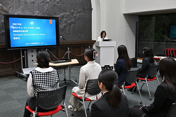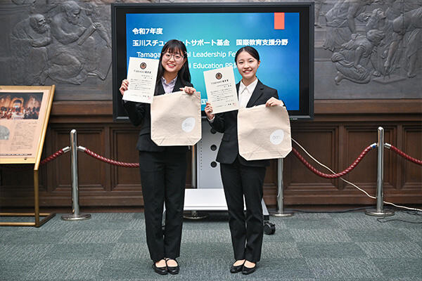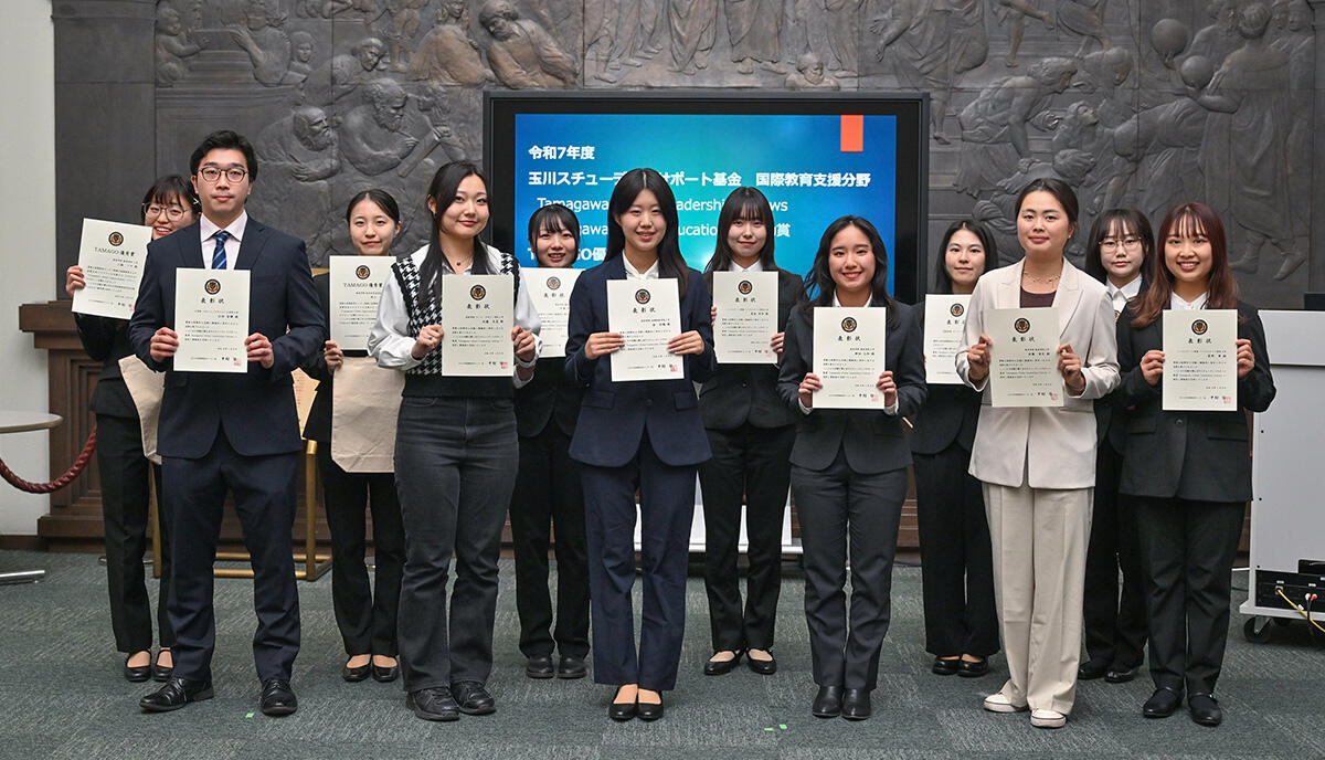 玉川大学では在学生の教育活動を支援するために、寄せられた寄付金と同額の支援金を拠出し、「玉川スチューデントサポート基金」を設置しています。「TGLF」は、この基金の一部を活用。世界で活躍できる人材を育成するために設立され、留学先で積極的に活動した学生や学内外の国際的なプログラムで評価された学生が選ばれてきました。2025年度は、11名もの学生がこの奨学金を受給。「TGLF」の表彰式と同時に国際教育を広める活動に貢献した学生に贈る「Tamagawa Global Education PR奨励賞」と、国際教育・交流活動などに貢献した学生に贈る「TAMAGO優秀賞」の表彰式も行われました。