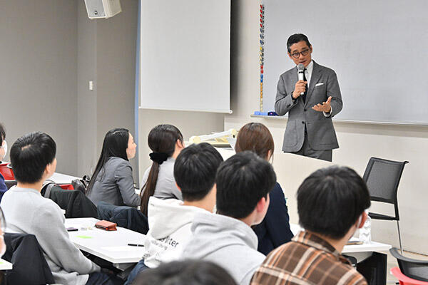 2026.02.19 大学すき焼きの老舗の、次の一手は?経営学部の学生たちが、「産学連携ゼミナール」で人形町今半の社長にプレゼンテーションを行いました。