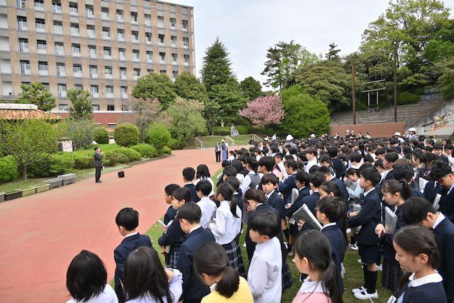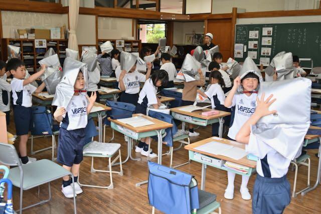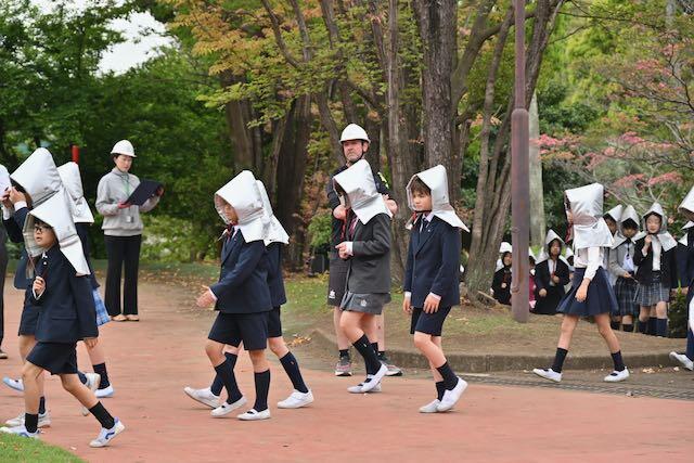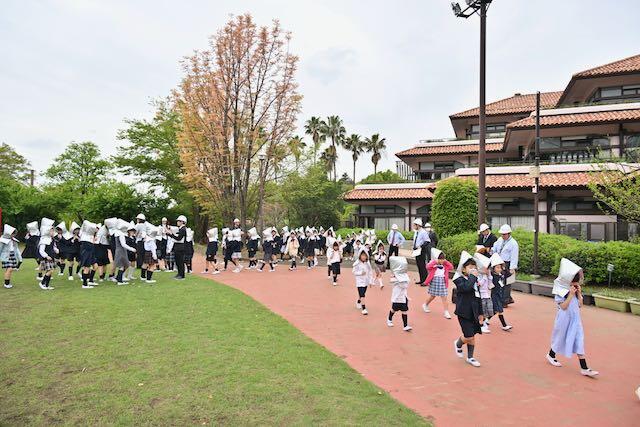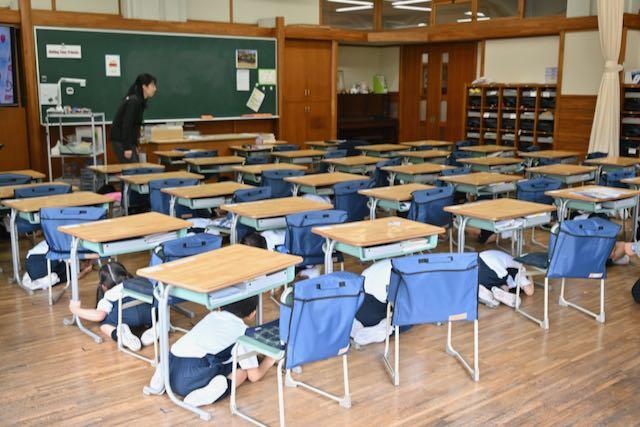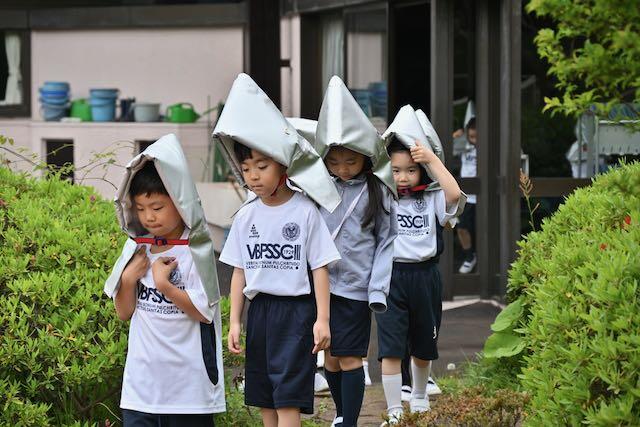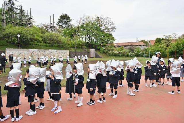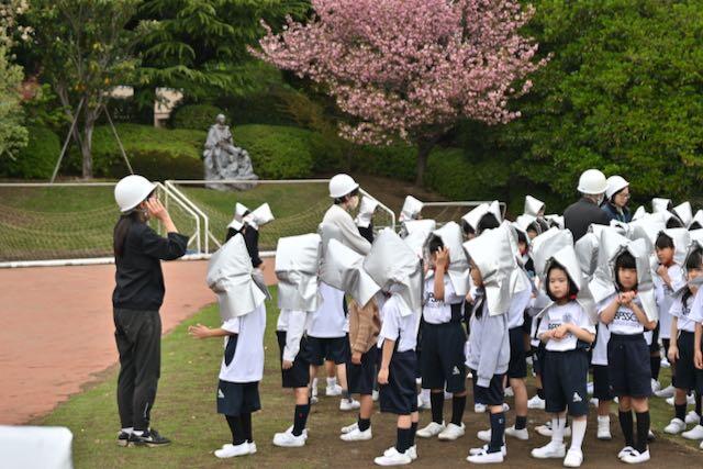 4月15日、新1年生を交えた防災訓練を実施しました。今回は地震を想定し、キャンパスセキュリティセンターの協力のもとで行われました。訓練放送が流れると、子どもたちは速やかに机の下へ避難。揺れが収まった後、防災頭巾を着用してグラウンドへ二次避難しました。「お・か・し・も」の約束を守り、全員が真剣な態度で取り組むことができました。