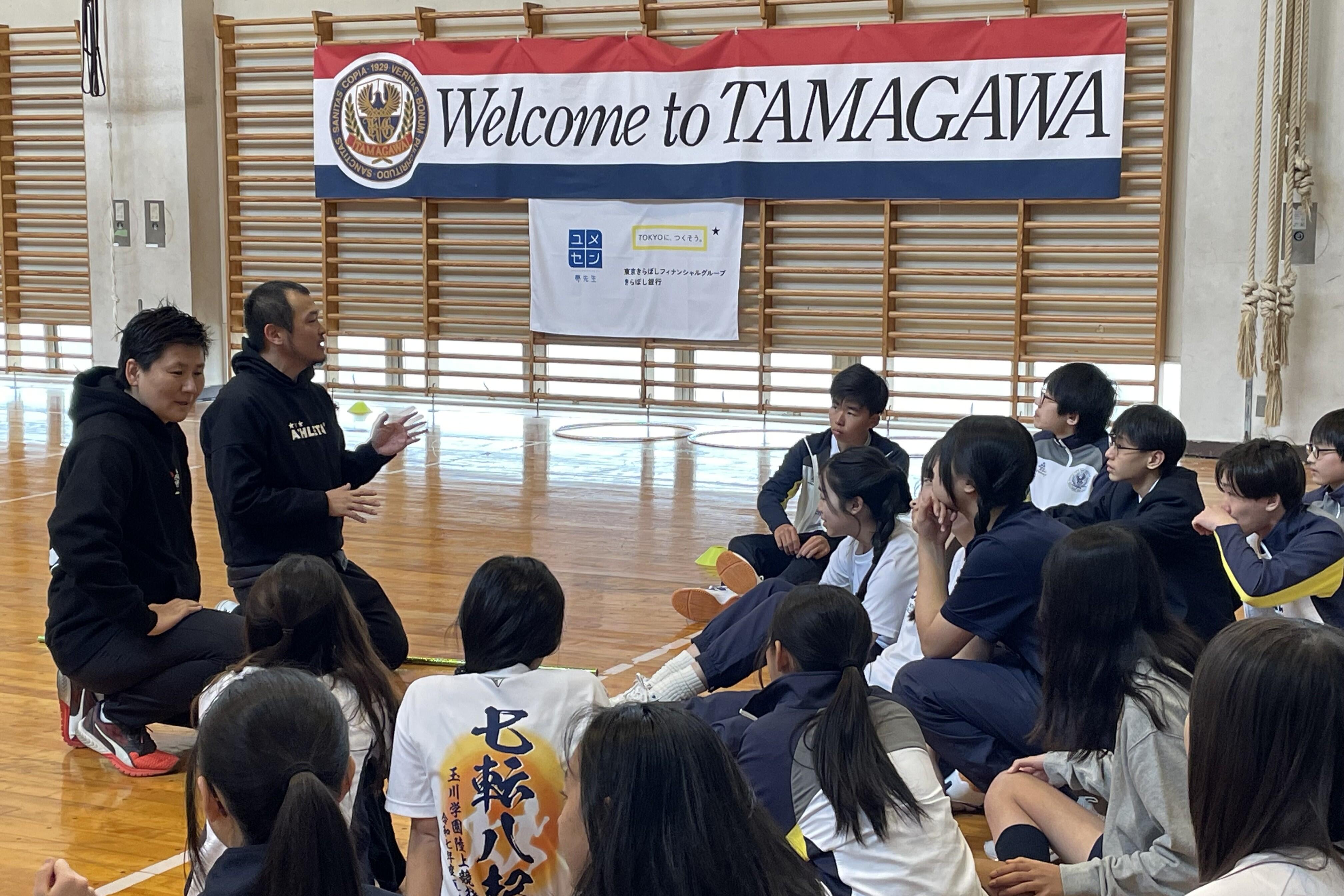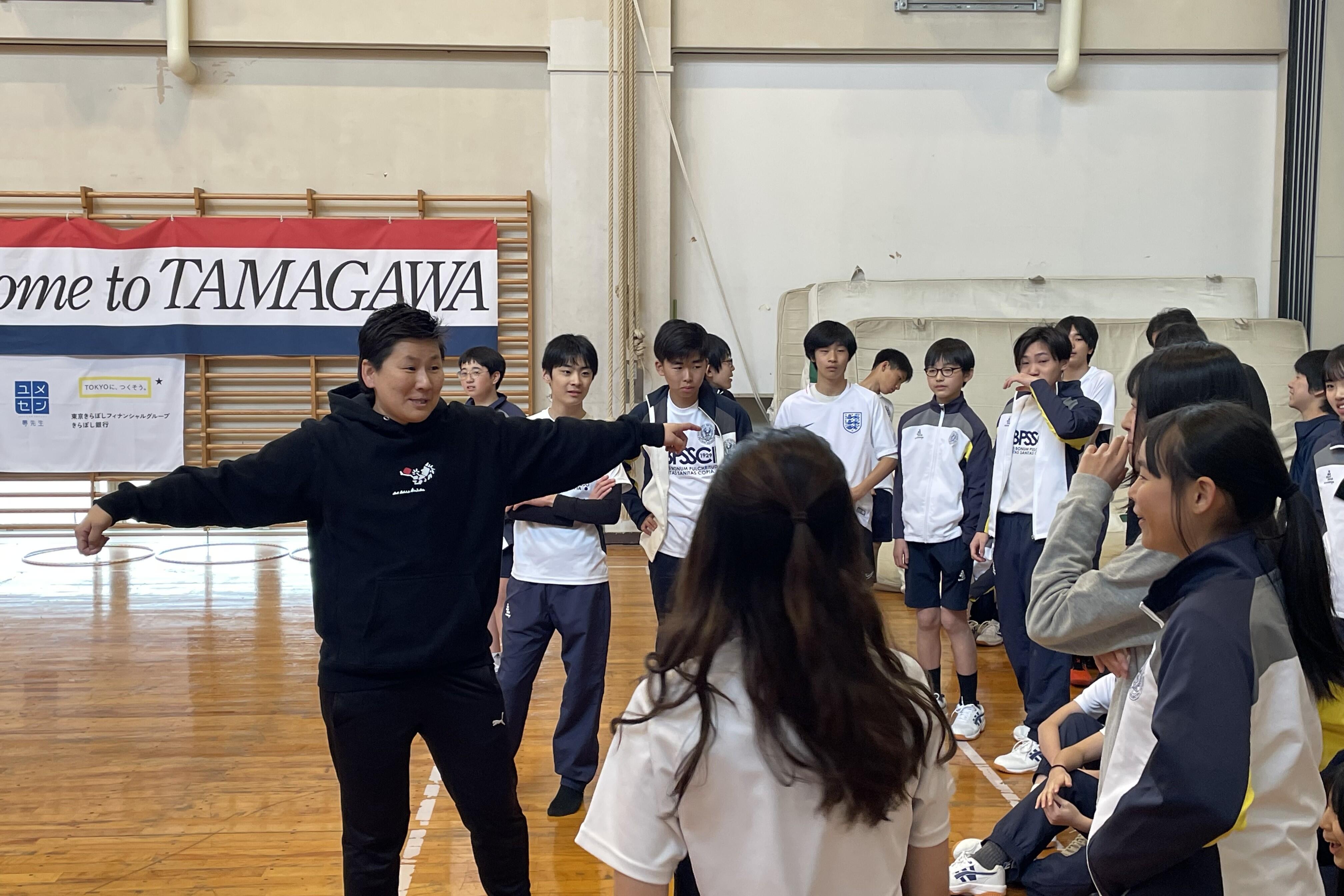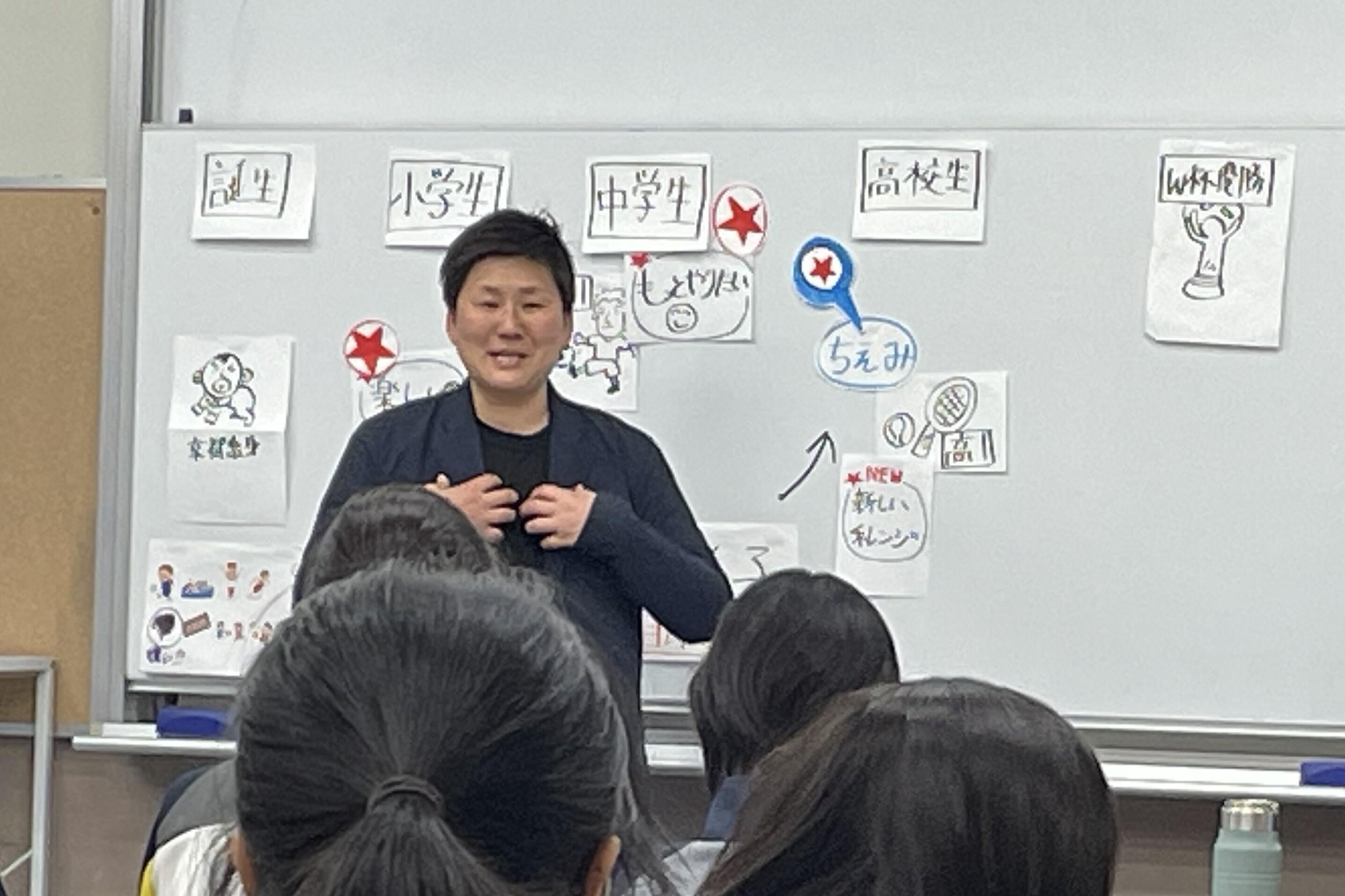 前半は体育館でのゲームで、決められた制約やルールの中で、夢先生を中心に話し合い、工夫・協力をしながらゴールを目指す楽しい体験をしました。後半、教室で行われた海堀さんによるトークの時間では、途中サッカーを離れる期間を経ながらもワールドカップの優勝に至るまでの体験を、夢と心の曲線を使いながらお話されました。他競技での経験、友人や恩師との出会い、世界のトップ選手のプレイを目にすることで受けた刺激、より先を目指す目標、そして共に目標を目指す仲間の存在、様々な経験と要素がご自身のワールドカップ優勝という結果を導いたことを語られました。最後に、生徒たちには「好きなことも嫌いなこともまずやってみること」、「出会いを大切にすること」、そして「誰かの夢を応援することは、自分の夢につながっていく」という温かいメッセージをいただきました。