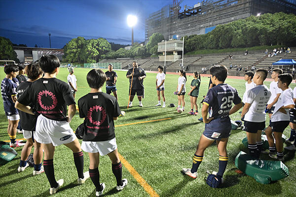 基本的な内容が中心でしたが、世界一流の元オールブラックスから「基本が大切であること」をあらためて学ぶことができました。また、全体レッスン終了後も、個別に英語で質問しながら熱心に指導を受ける生徒の姿も見られ、最後まで熱気にあふれるクリニックでした。 普段の練習とは異なる緊張感の中で指導を受ける生徒たちの真剣な表情が印象的でした。