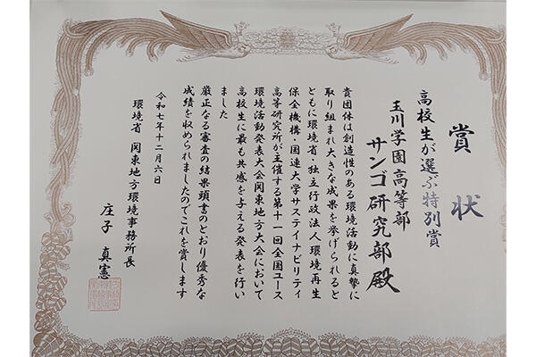 2025年12月に実施された第11回全国ユース環境活動発表大会 関東地方大会において、玉川学園高等部サンゴ研究部は1次選考を突破した13校の中から、「高校生が選ぶ特別賞(第2位)」を受賞しました。この快挙により、関東地方大会上位2校にのみ与えられる全国大会出場権を手にしました!