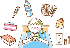 □体温計 □不織布マスク □経口補水液やスポーツ飲料 □インフルエンザ・新型コロナウイルス検査キット □備蓄できる食料品(レトルトのお粥やうどん・即席スープ類・インスタント食品・ゼリー飲料など)□冷却シート □ビニール袋 □使い捨て手袋 □使い捨て容器 □消毒液(アルコール消毒や※塩素系漂白剤)