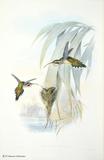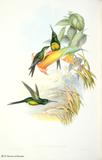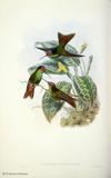 南アメリカに住むオオハシ類は、名前のように大きな色彩豊かな嘴を持っており、羽色はデザイナーが見たらびっくりするような斬新な組み合わせです。また南アメリカ、熱帯アジア、アフリカに住むキヌバネドリ類は、名前のように羽毛の先端が絹糸を梳かしたように細かくなっており、それらがキラキラ輝いて見え、原色で美しい鳥です。北アメリカのウズラ類は、羽色にきらびやかさはないが、キジの仲間特有の羽毛模様の複雑さと整然さは、画工の心をずいぶんと悩ませたことでしょう。南アメリカ、一部北アメリカに住むハチドリ類は、金属光沢を持つ羽毛の美しさと、形態の不思議さ、習性の面白さを合わせもっていることを考えると、グールドが触手を伸ばさない手はないが、むろん彼はハチドリに挑戦しています。