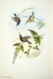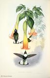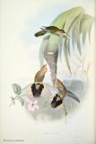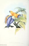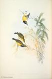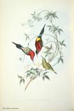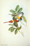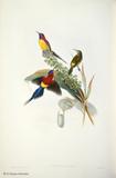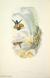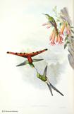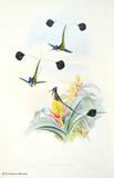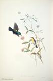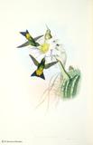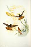 グールドは、ハチドリの輝く羽装を何とか表現しようとして、図版に工夫をこらしています。今日においてもグールドの描いたハチドリ類の図版の美しさの評価は、高まるばかりです。グールドは、1849~61年にかけて「ハチドリ科鳥類図譜」5巻を出版しました。グールドの死後1880~87年に友人のシャープによって「補遺」が出版されました。タイヨウチョウ類は「アジア鳥類図譜」、「オーストラリア鳥類図譜」、「ニューギニア及びパプア諸島鳥類図譜」の中に何種類か描かれています。