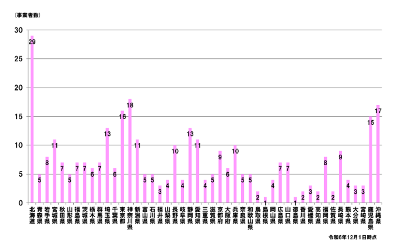 平成4年すなわち1992年1月に開始されて以来、1995年の阪神淡路大震災、それ以外の自然災害の影響もあり、1996年からコミュニティFMは急増し、大規模自然災害が増え続ける中でコミュニティFMの開局を検討する自治体や地域の企業が増えているそうです。2024年12月時点で全国に345局があるそうです。表にコミュニティ放送事業者数を都道府県別で示します(総務省電波利用ポータルより引用)。