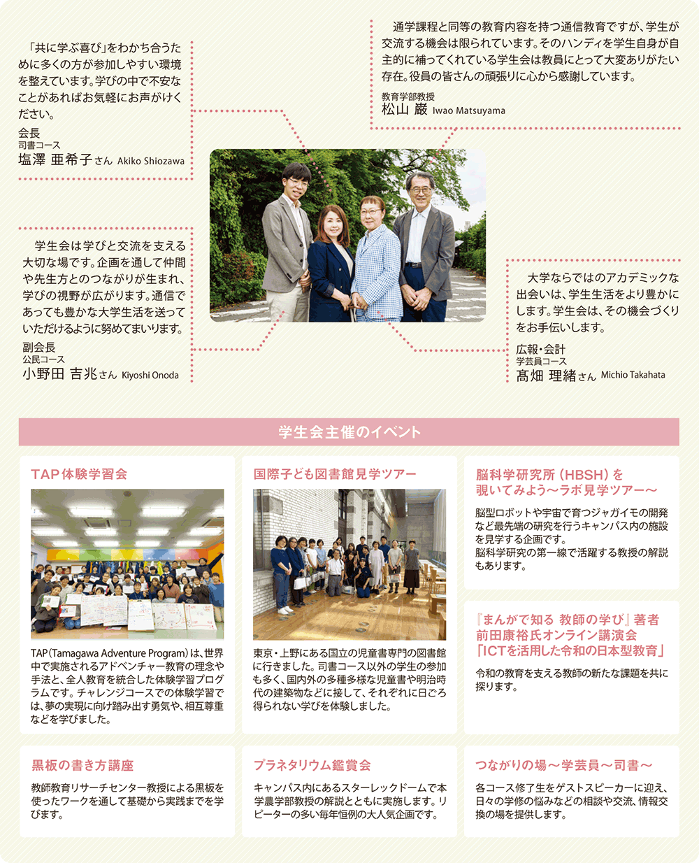 「学生会」は通信教育課程に在籍する学生で組織され、学友間の円滑なコミュニケーションと相互啓発・親睦を図るため、学修会や交流会等の企画・運営を行っています。こうした活動を通して、 自主性・協調性・指導力を身につけ、 人間的な成長を図ります。
