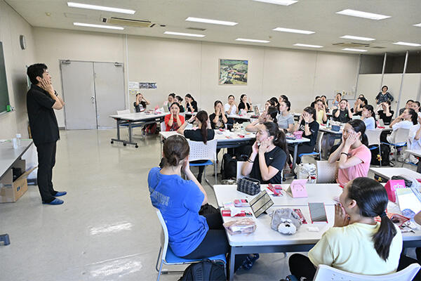 この日の講座には、JULIASのメンバー約50名が参加。これから自分たちで競技用のメイクを体験するため、全員が普段のメイクを落としての参加です。