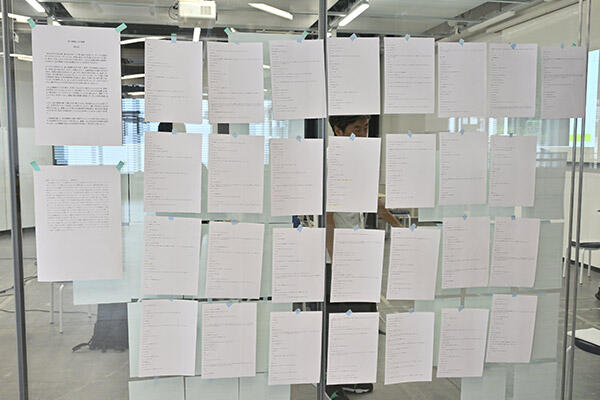 さらに全員の「体験作文」はすべて教室の壁に掲示され、グループ内の他の2人の作文=ライフヒストリーをしっかりと読み込んだ上で、グループ4人での「Future in Hands」を使った未来シナリオの作成に再チャレンジしました。1日目の「Future in Hands」と2日目の「体験作文」と同様、「都市」「健康」「教育」からグループ毎に話し合って好きなテーマを選んでから実施されました。今回は3グループとも「健康」をテーマとして選び、それぞれ「睡眠の質をあげることがビジネスとなる未来社会」「瞑想などによる心の健康を重視する未来社会」「数値化された健康を競い合う未来社会」などをAIによって動画化することに成功しました。