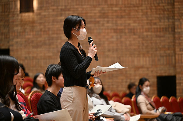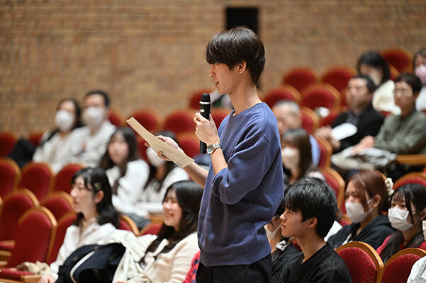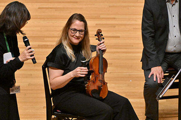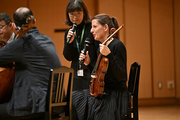 高村柊子さん(リベラルアーツ学部リベラルアーツ学科3年)は、身体を使って演奏するうえで意識していることについて、第2ヴァイオリンのオルロフスキーさんに尋ねました。オルロフスキーさんは、「とても良い質問ですね。まずは両足がちゃんと地面に付き、体重が均等にかかっていることを確認します」と説明し、楽器の振動で体が自然に動いていくことを感じながら練習することを勧めました。