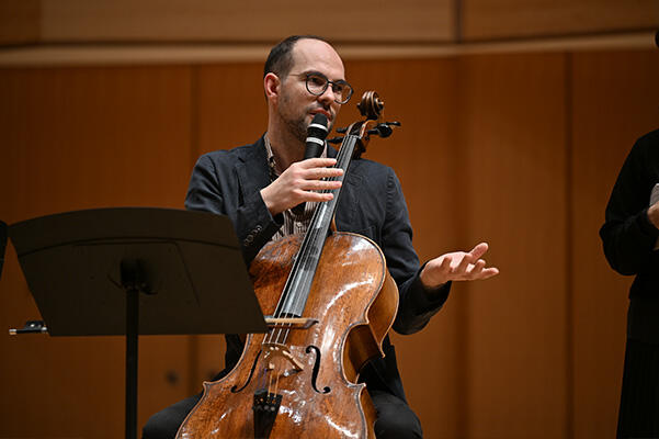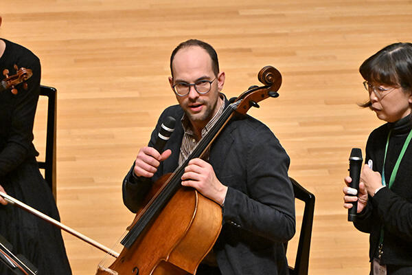 そして、中村海智さん(芸術学部音楽学科3年)がチェロのシンケヴィッチさんに、ビブラートのかけ方やパート内での演奏の統一方法を聞くと、ビブラートを実演してからシンケヴィッチさんはこう言いました。 「オーケストラでは、各自の『こういう風に弾きたい』という意思が伝わると次第に揃っていきます。パート内で揃える必要はまったくなく、それぞれが持つ個性がミックスされて響くのが音楽です」