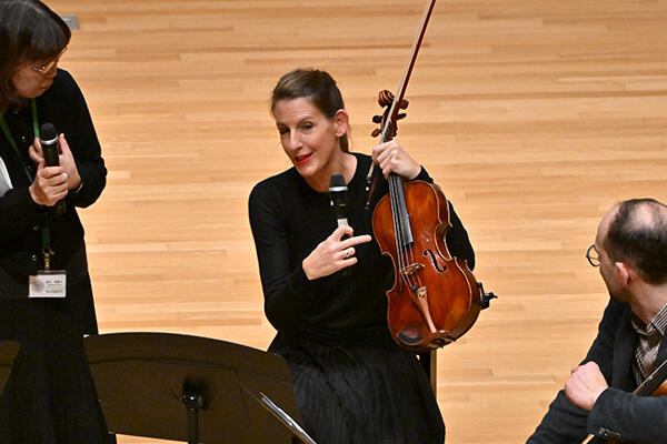 阿部真菜果さん(芸術学部音楽学科3年)の「高いポジションでも優しい音色を出すには?」という質問には、ヴィオラのガルテマンさんが、弓を押しすぎないことやビブラートをかけることなどをアドバイス。