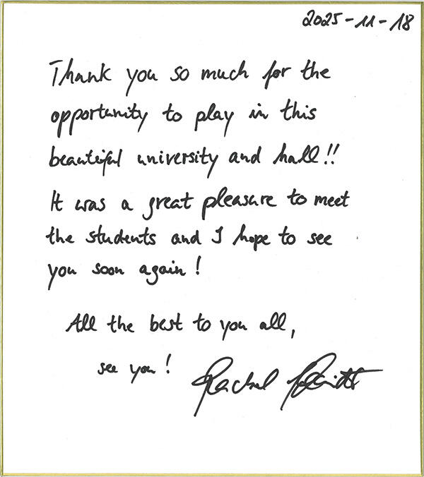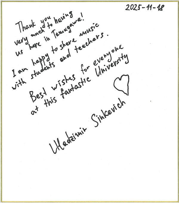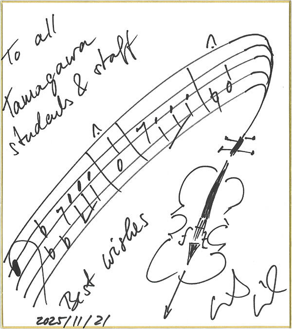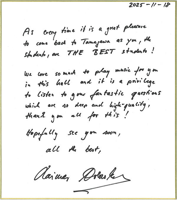 この素晴らしい玉川大学のコンサートホールで演奏する機会に感謝します。学生のみなさんとお会いできたことは大きな喜びです。また、お会いしたいです。