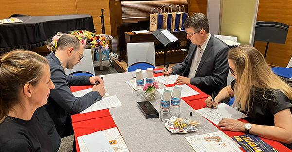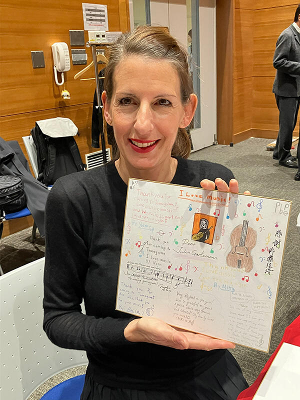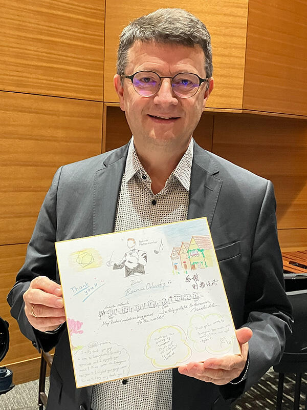今回のプログラムにご参加いただいたベルリン・フィルのメンバー4名から、温かいメッセージをいただきました。なお、写真で皆さんが手にしている色紙は、Primary Division(小学校1年生~5年生)の児童および教員から贈られたものです。