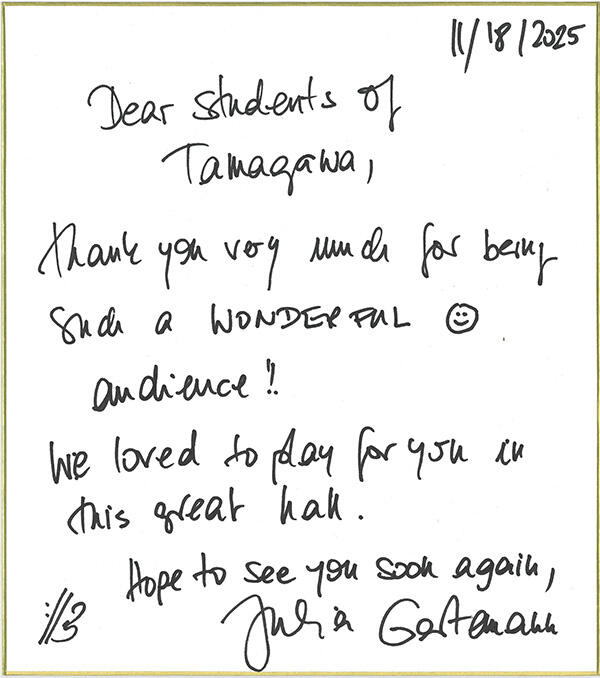 あなた達が最高の学生/児童生徒なので、毎回、玉川に帰ってくることは大きな喜びです。私たちは、このコンサートホールで演奏できることが大好きです。そして、みなさんからのとても深く、質の高い、素晴らしい問いを聴けることは光栄なことと感謝しています。また、近いうちにみなさんに会えますように。