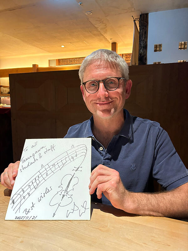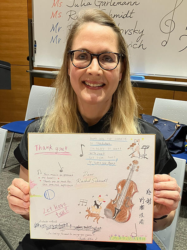 今回は来園が叶いませんでしたが、本プログラムの実現にご尽力いただき、玉川学園のファンとしてこれまで何度も来園されているマシュー・ハンター氏(ヴィオラ)、ニコラウス・レーミッシュ氏(チェロ)からも、メッセージをお寄せいただきました。長年、メンバーとのコーディネートをしている教育学部の大谷千恵教授がお2人からのメッセージを預かりました。色々な部署の先生方が連携して「玉川―ベルリン・フィルハーモニー管弦楽団員 教育プログラム」は実現しています。