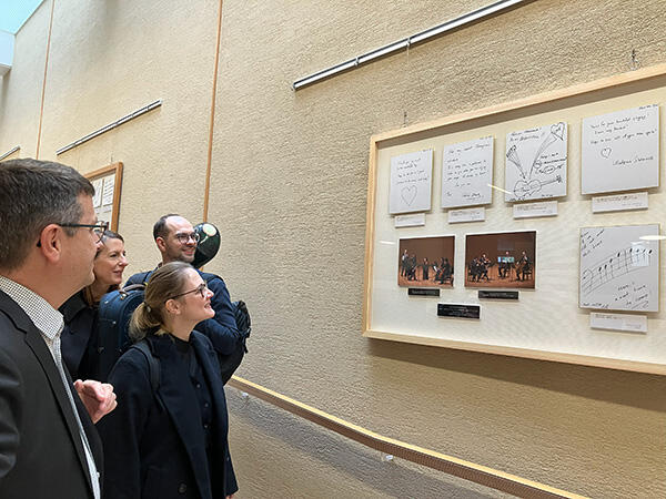 University Concert Hall 2016の廊下に展示されている、これまでに実施したプログラムの際にベルリン・フィルのメンバーから寄せられた歴代の色紙や写真をご覧になり、とても喜んでくださいました。