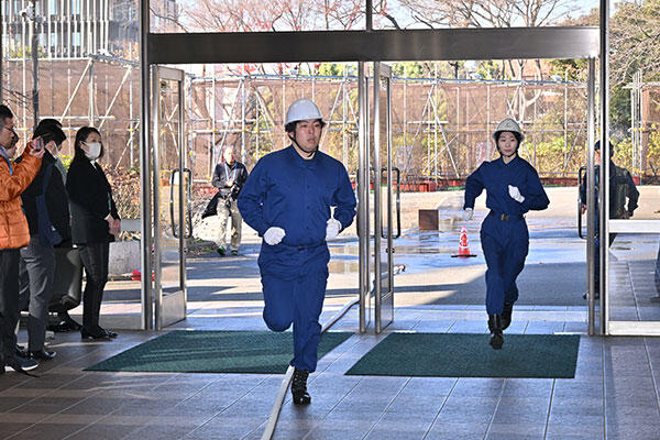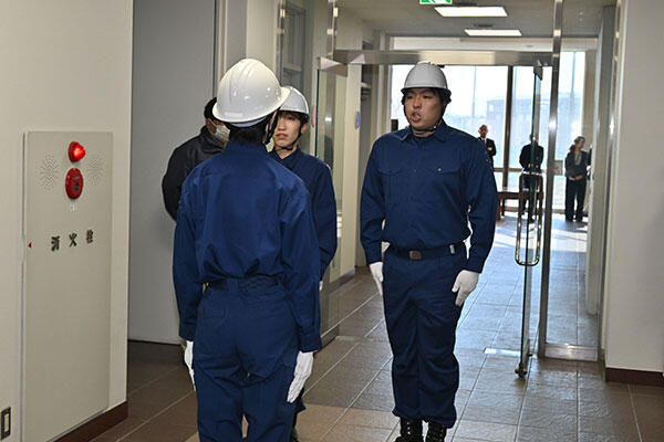 今年度選出された自衛消防隊員3名の職員を中心に、「通報・避難誘導・初期消火」をテーマとした実践的な訓練が行われ、約3か月間の訓練成果を現場で確認する機会となりました。