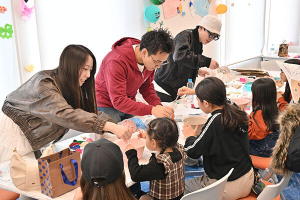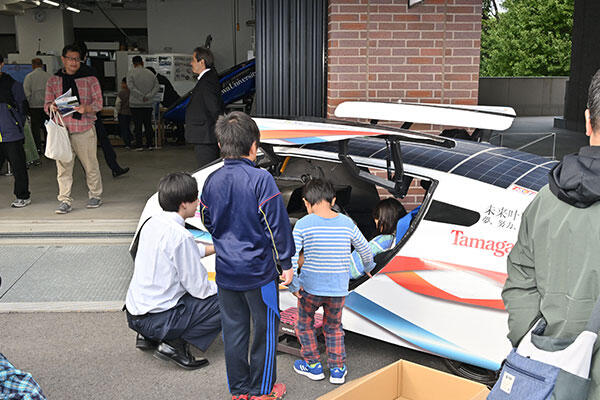コスモス祭の特徴の一つは、各学部が日頃の研究成果を発表する点にあります。ゼミや研究室を中心に展示を行い、多くの教室でスーツに身を包んだ学生たちが説明を担当。難解な内容を、一般の人にも分かりやすく伝えるといった工夫が見られました。また教育学部による子どもを対象とした遊びのコーナーや、芸術学部によるガラス工房での吹きガラス体験など、さまざまな企画が人気を集めていました。また農学部の農場では、毎年人気の玉川のキャンパス内で育てた野菜の販売が行われました。キャンパスの一番奥という立地にもかかわらずオープン前から長い行列ができ、午前中には売り切れてしまうという人気ぶり。ESTEAM教育を推進し異分野融合に取り組む玉川大学ですが、コスモス祭は学生にとっても他学部の学びを知る、絶好の機会となっています。