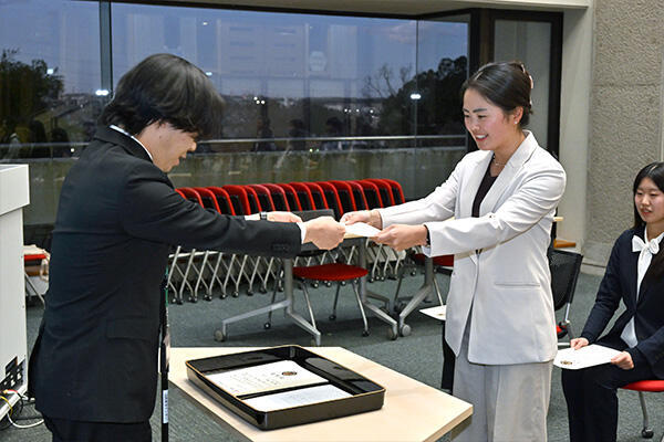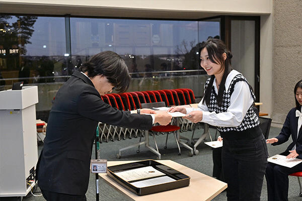 「本学はCAP制度※などもあり、国際的な活動に時間を割くことは容易ではなかったと思います。そうした中でも皆さんは時間を作り、また学内外で参加すべきプログラムを見つけ、地道に活動を積み重ねてこられました。そんな皆さんにお伝えしたいのは、①この取り組みを一時のものにしないということ、②今回の表彰を自身の活動を振り返る機会にしてほしいということ、そして③これをゴールとせず研鑽を重ねてほしいということ、最後に④オンラインの時代ではあるけれども対面でのコミュニケーションを大切にしてほしいということです。この四点を皆さんにお願いしたいと思います」