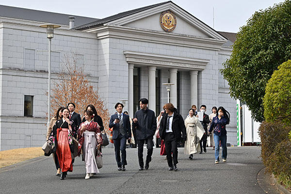 その上で「自分を語る際に学歴や職業を結びつける人もいますが、それが如何におかしなことか、皆さんなら理解できるはずです。皆さんの中には既に進むべき道を見つけた人もいれば、まだ見つけられない人もいるかもしれません。どんな状況も、答えにたどり着くための大事な道程です。自分が納得できる今を積み重ねていけば、誰にも真似できない道が出来上がるはずです」とエールを送り、「社会に出れば、先生から与えられる目標も、模範解答も皆さんの前にはありません。しかし皆さんの中には全人としての心の品格や、自らを発展させていく強さが育まれています。いずれわが道が完成した時、一体自分は何者なのか、何のために生まれてきたのか。その答えがようやく見えてくるのではないでしょうか。皆さんの「わが道」に向けた地道な労作が誰かの救いや喜び、癒しとなることを、そして堂々と自分らしい今を生きてくれることを切に願っています。今日はご卒業、ほんとうにおめでとう」と、卒業生たちの門出を祝いました。