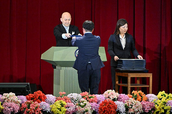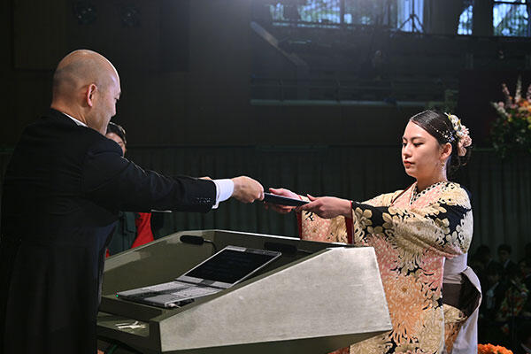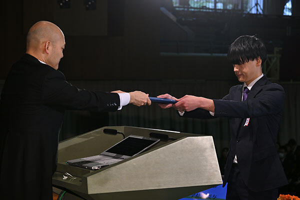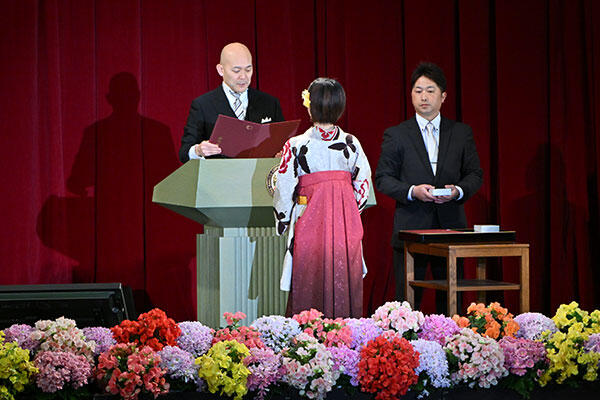 続いて行われた学位記の授与では、各学部学科の代表者が登壇。小原一仁学長から学位記を受け取る学生たちは、皆晴れやかな表情です。