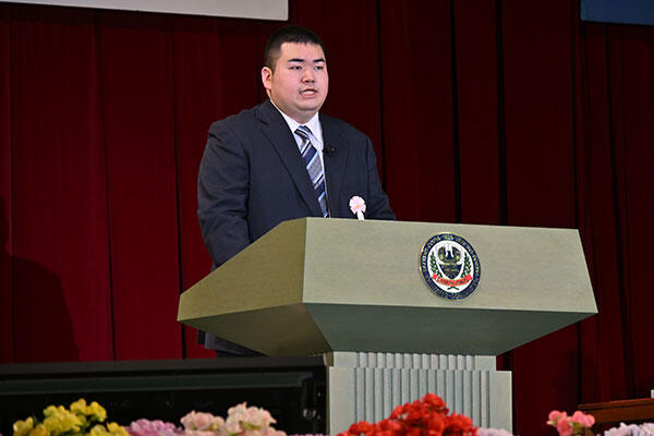 「英語教師を目指して本学の門をくぐったものの、その道のりは平坦ではありませんでした。けれども仲間や先生に励まされ、歩みを進めることができました。ラーニングコモンズで仲間と過ごした時間は、かけがえのない思い出です」と、キャンパスでの日々を振り返った文学部英語教育学科の若林尚輝さん。アメリカの教育哲学者、ジョン・デューイの『教育は人生への備えではない。教育とは人生そのものである』という言葉を引用し、「春からは英語教師としての一歩を踏み出します。私自身の大学生活同様に、学校での学びや経験が生徒たちのかけがえのない思い出となります。生徒一人ひとりの人生に、光をともせるような教師を目指します」と、決意を語りました。