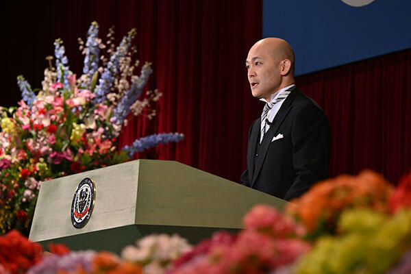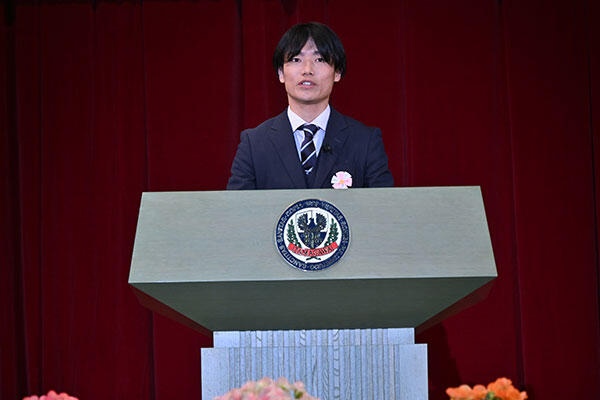そしてもう一人の卒業生代表である農学部先端食農学科の渡邉諒人さんは、高校まで続けていた陸上競技に区切りをつけたこともあり、入学当初は目標を見失っていたと言います。「そうした思いから、勉学にそれまで以上に真剣に取り組むようになりました」。ブドウのポリフェノールを題材に、卒業研究にも没頭。そのために北海道の弟子屈農場にも足を運び、収穫を手伝ったそうです。「研究が思うように進まないこともありましたが、先生や仲間に励まされて粘り強く試行錯誤を繰り返しました」と、玉川大学での多くの人との出会いと学びに没頭できた時間は、宝物だと語る渡邉さん。二人とも恩師や家族への感謝の言葉も忘れず、会場から温かな拍手が送られました。