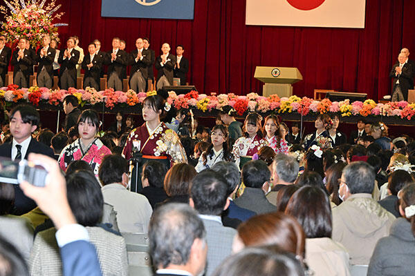 学長の祝辞に続いて、出席者全員で校歌を合唱。皆で校歌を歌う最後の機会でもあり、卒業生たちの歌声が会場に響きました。こうして卒業式は幕を閉じ、卒業生たちが退場していきます。最後の一人が会場を後にするまで、拍手が途切れることはありませんでした。