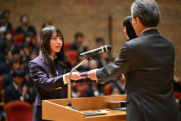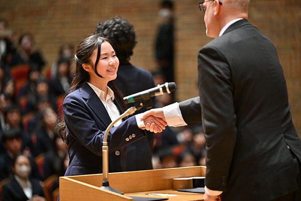 平本さんは、玉川学園展ペガサス祭(文化祭)の副実行委員長として高校生と一緒に運営に携わったことで、「広い視野を持って自ら仕事をつくり出す作業に翻弄されながらも、新たなコミュニティに属することがとても有意義であることを経験しました」と話しました。また、「坂のまち元気プロジェクト」で地域の方々と一緒に取り組んだり、英語劇部に所属して卒業生から指導を受けたことで、「知らない世界が広がっていることに気付かされました」と振り返りました。そして、「いま、広い視野を持って新しい世界へ踏み出す準備ができました。これから先、胸を張って自分の夢を語れる人でありたいと思います」と締めました。