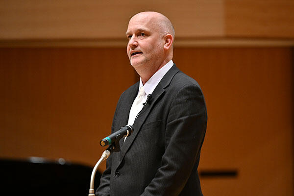 授与が終わるとファーニバル先生が英語でスピーチをしました。玉川学園では、世界基準の教育プログラム「国際バカロレア(IB)」を取り入れた「IBクラス」が、6〜12年生(高校3年生)に設置されています。