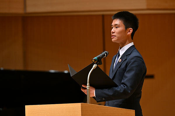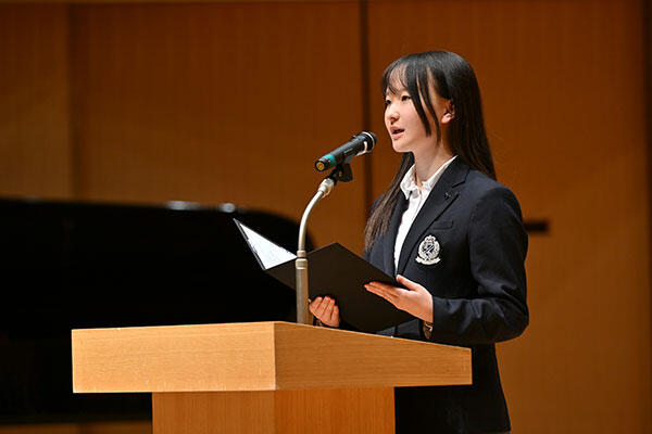 杜さんが思い出に残ったのは、7年生(中学1年生)で参加した模擬国連大会です。「中国の大使になりきり環境問題について議論するはずでしたが、会場で強い緊張を感じました。それでも挑戦を諦めずに発言しました」と述べました。そこで得た勇気はその後の活動につながり、内閣府のプロジェクト「世の中ちょっと良くする部」に参加したり、玉川学園で開催した模擬国連大会で副議長を務めたことを報告。「これからラウンドスクエア実行委員会や海外研修にも挑戦していきたい」と意気込みを語りました。最後に「3年間の経験から得た勇気・自信こそが、これからの大切な土台となるでしょう。いまの私たちは自信を持ち、新たな一歩を踏み出す準備ができています!」と力強く語りました。