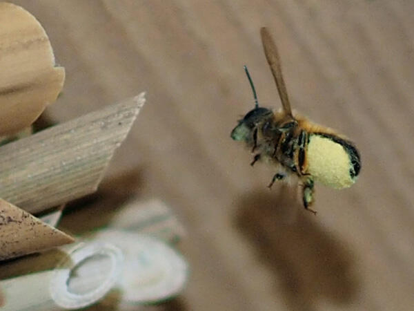 巣へ花粉を運びこむメス。メスの腹部下面には花粉を運ぶための毛が密生している