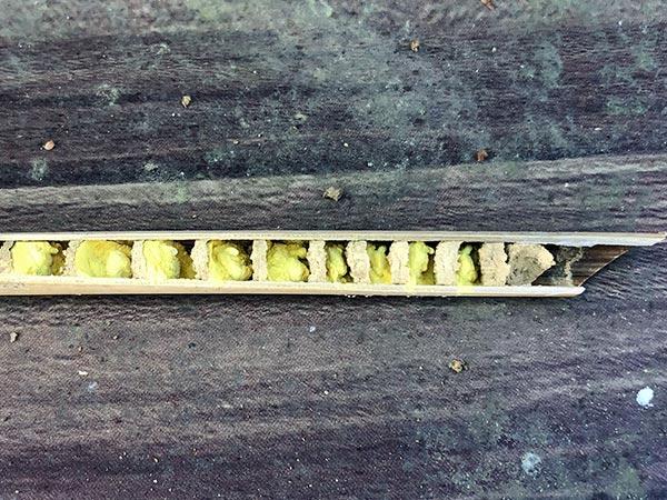 葦筒に作られた巣の内部。泥壁で仕切られた小部屋の中に、蜜を混ぜ込んだ花粉と卵がある