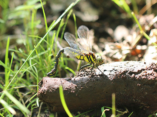 本種は沖縄を除く国内に広く分布するが、北海道での生息地は局所的で、屈斜路湖周辺は最北東の分布地の一つだ。ヤンマの仲間としては小型で、茂みの隙間を巧みに飛ぶほか、時に地面近くに止まるため、不意に足元から飛び上がり驚かされる。種名の〝更紗 〟とは、インドが起源の 唐草 模様で、腹部の対称的に並んだ三角形からこの名が付いたとされる。