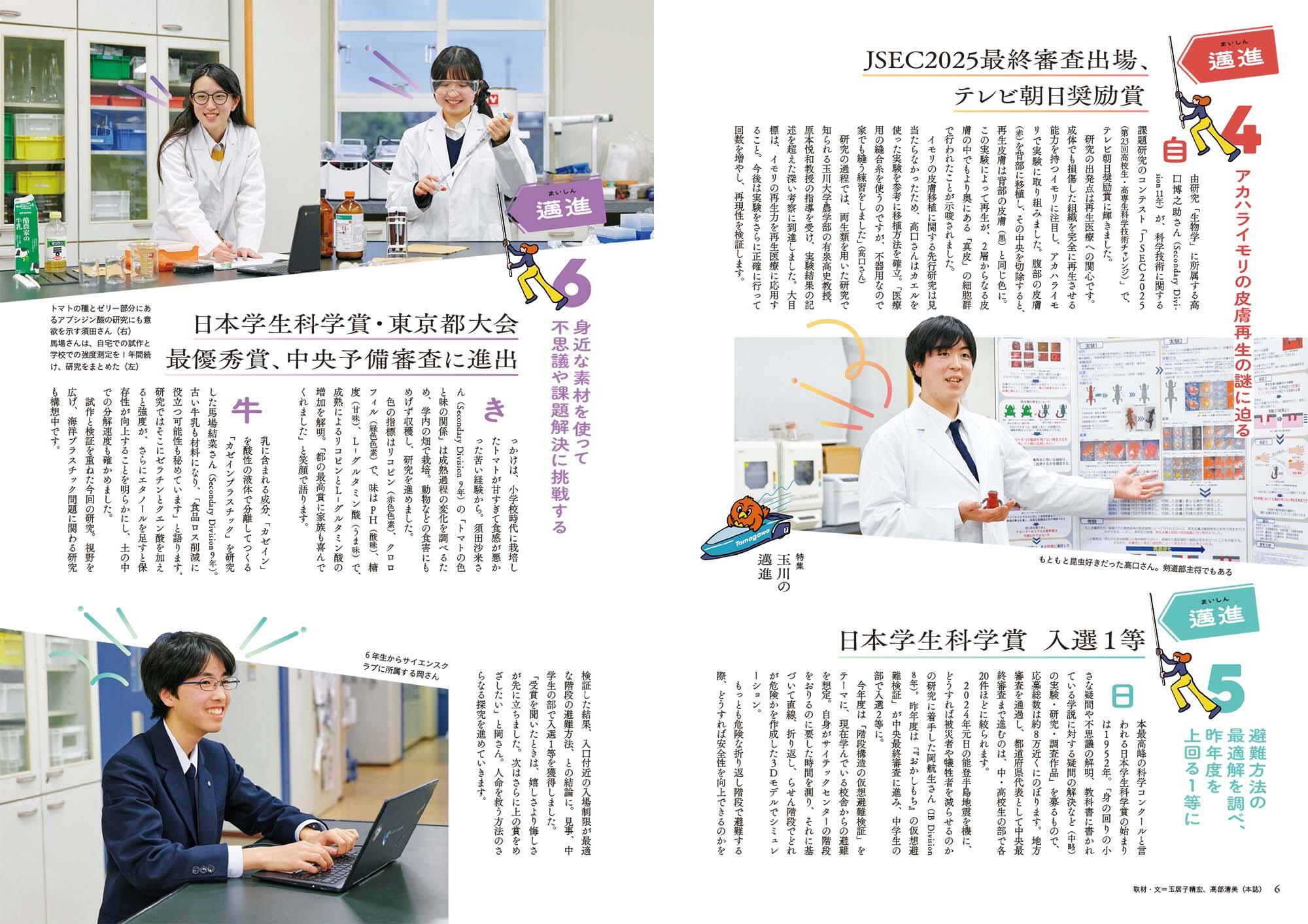 9月号の巻頭特集は「わたしの自由研究」。創立期から変わらず玉川学園が大切にしてきた自由研究の時間。今号ではSecondary Division6~12年生の自由研究に焦点を当て、一人ひとりの関心に応じて探究を進める児童生徒の様子を紹介します。新連載「耕す人」では、キャンパスで土を掘り起こし、種をまく人たちを紹介します。第1回となる今号は、農学部園芸班の活動を取り上げます。「玉川の先輩を訪ねて」は、石川県能美市に拠点を構える化学素材メーカー、小松マテーレ株式会社代表取締役社長の中山大輔さんにインタビューしました。「研究室訪問」では、劇団四季の団員として『オペラ座の怪人』などの作品に出演し、現在は芸術学部でミュージカルを指導する長裕二教授から話を聞きました。このほか「CAMPUS TOPICS」では、Secondary Division、IB Division6~12年生の音楽祭、内閣府が進める戦略的イノベーション創造プログラム(SIP)に参画する生徒たちの取り組みなどについて報告します。今月も玉川教育の最新情報をお届けします。