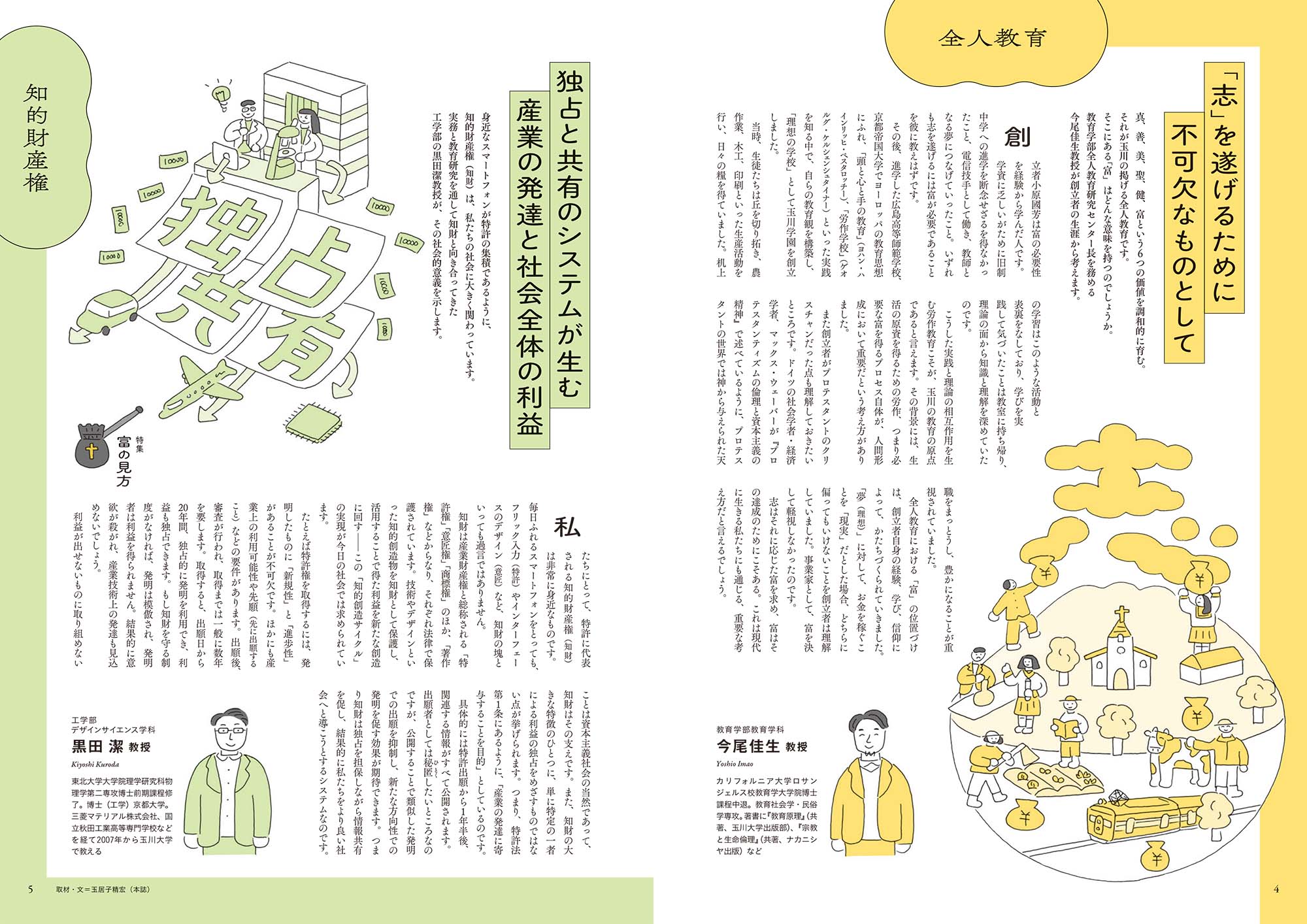 4月号の巻頭特集は「富の見方」。真、善、美、聖、健、富の6つの価値の調和的な創造を教育の理想と位置づける全人教育において、「富」とは何をさすのか。また、知的財産権、演劇、会計学、観光ビジネス、脳科学の視点から「富」の見方や捉え方を大学教員・研究者とともに考えます。「玉川の先輩を訪ねて」には地域に根ざした蕎麦屋の根津「鷹匠」を営むかたわら、片手袋研究家として活動する石井公二さん(文学部2003年卒業)が登場。新連載「10代のための玉川論文ガイド」では、工学部の三林洋介教授らが発表した研究論文「夜間自動車運転時の瞳孔変化に関する基礎的研究」をわかりやすく解説します。今月も玉川教育の最新情報をお届けします。