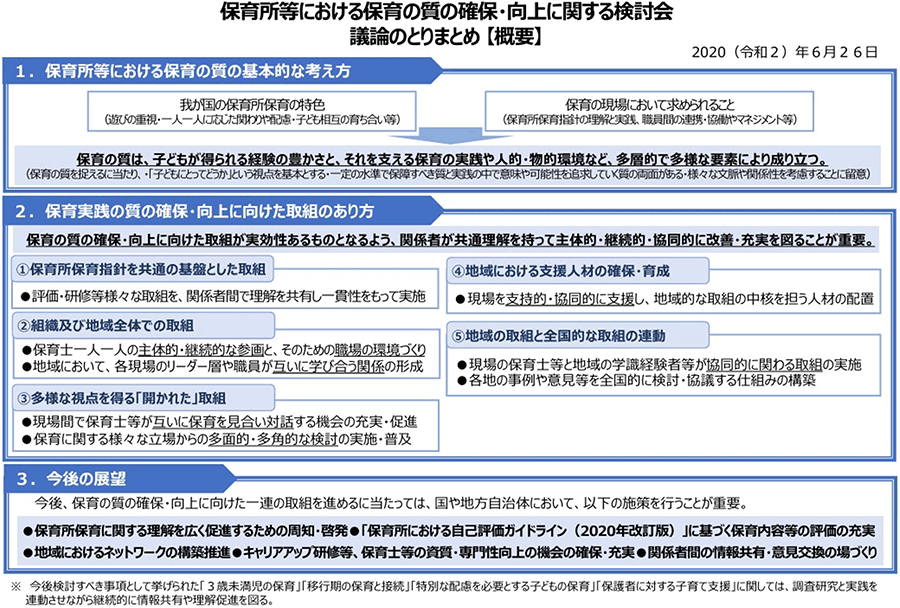 保育の質の確保と向上のためには、何が必要なのでしょうか。厚生労働省の「保育所等における保育の質の確保・向上に関する検討会」の報告書「議論のとりまとめ 「中間的な論点の整理」における総論的事項に関する考察を中心に」(2020)において、以下の図表のようにその概要が整理、報告されています。