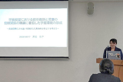 4月9日(木)に、「学校課題研究」のテーマ・構想発表会を実施しました。今年度はSM2年生9名と現職院生4名が、教科における指導法に関する研究や総合的な学習の時間に関する研究、学級経営、教育相談など多岐にわたる分野について、それぞれの立場から発見した課題にフォーカスした研究構想を発表しました。発表会には教職大学院の先生方だけでなく、今年度入学したばかりのSM1年生も参加し、合わせて40名を超える参加者で実施することができました。